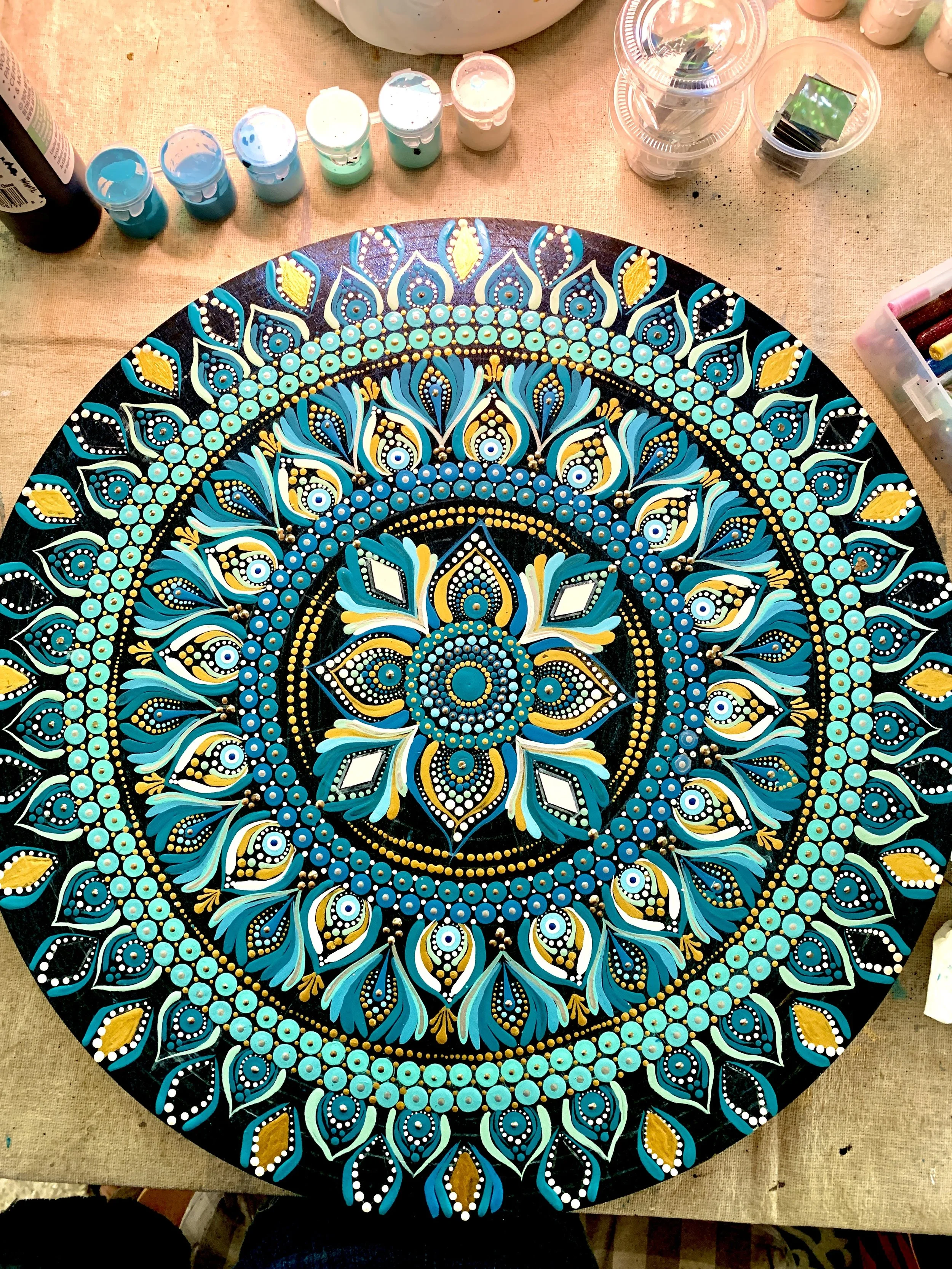 Together, we’ll open the conversation. We’ll get a pulse for the energy you want created in the space your Mandala will hold. I’ll follow the intuitive path we open up, paint the frequency, and send you the medicine encoded in sacred geometry, centered, peace, and adventurous color.